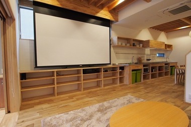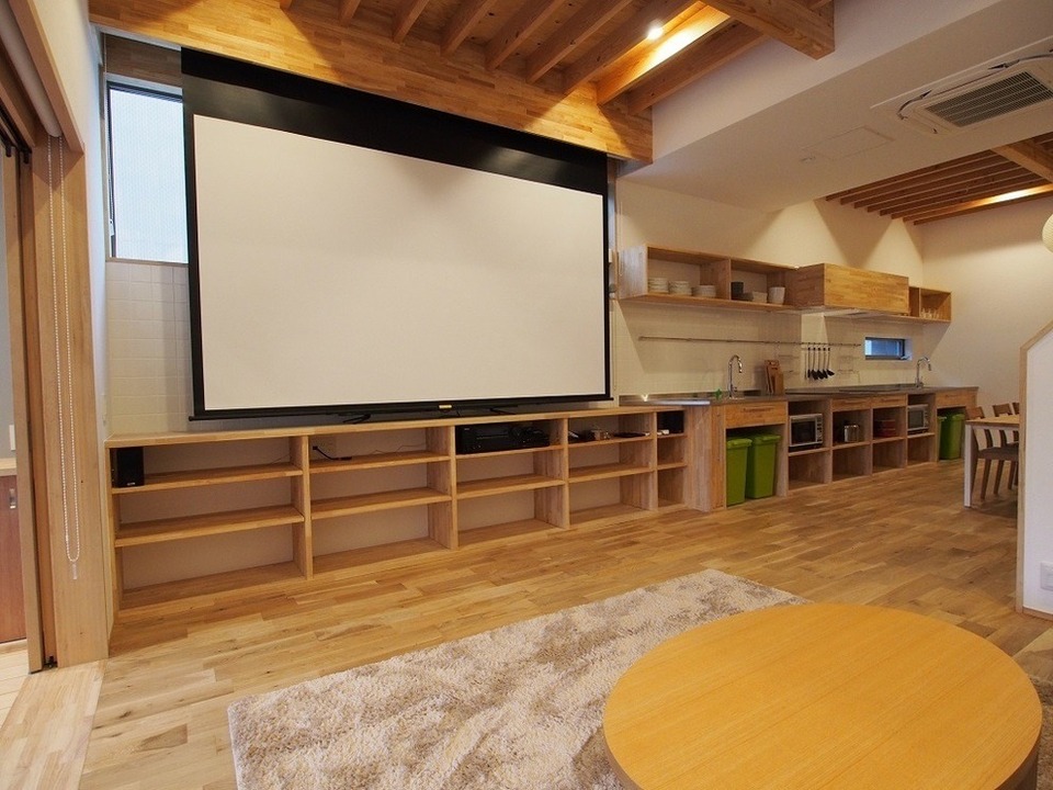 共用スペースには大型スクリーンを設置し、映画鑑賞や住人同士の交流が生まれる空間を実現しました。