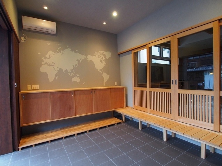 土間の壁面には大きな世界地図を設置。迫力ある仕上がりとなりました。