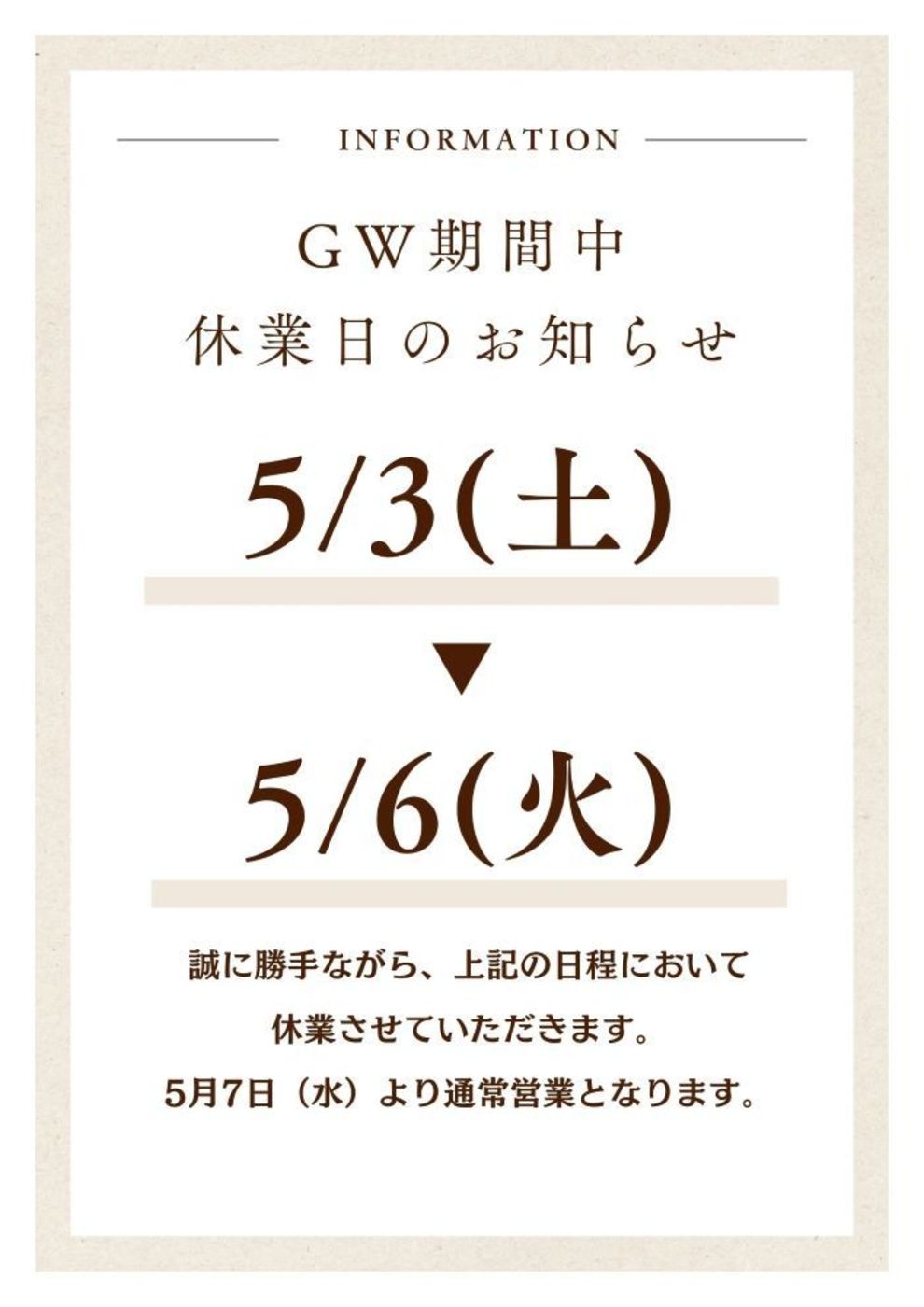 2025/04/10 お知らせ GW休業日のお知らせ こんにちは! 三輝のGW(ゴールデンウィーク)のお知らせです!! 誠に勝手ながら5/3(土)~5/6(火) は休業日とさせていただきます。 よろしくお願いいたします。 一覧へ戻る